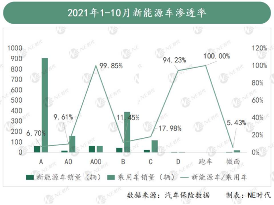 據(jù)汽車保險數(shù)據(jù)顯示,目前整個乘用車市場以A、B、A0、C、A00級車為主。 以今年前十個月的銷量來看,這些主流級別車型中,新能源車滲透率最高的還是A00級車型,其他級別車型的電動化替代空間基本都在90%以上。A級車作為乘用車市場體量最大的一部分,也是目前電動化轉型壓力最大的一個市場。