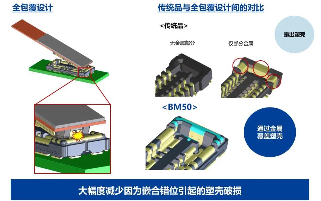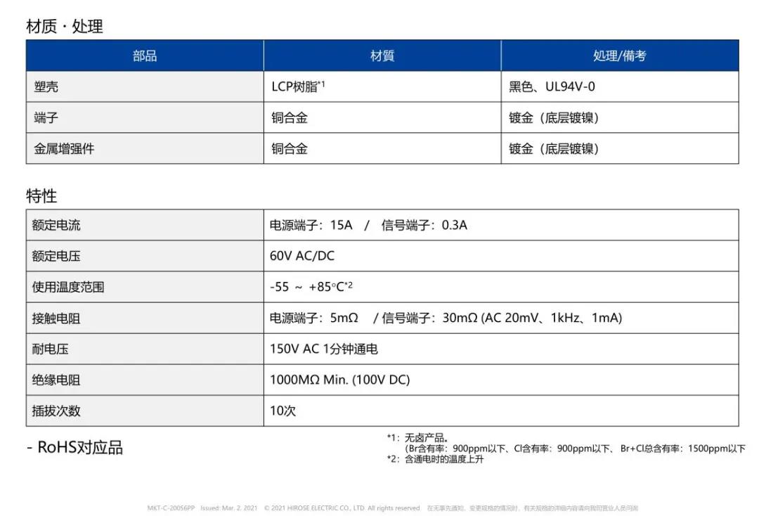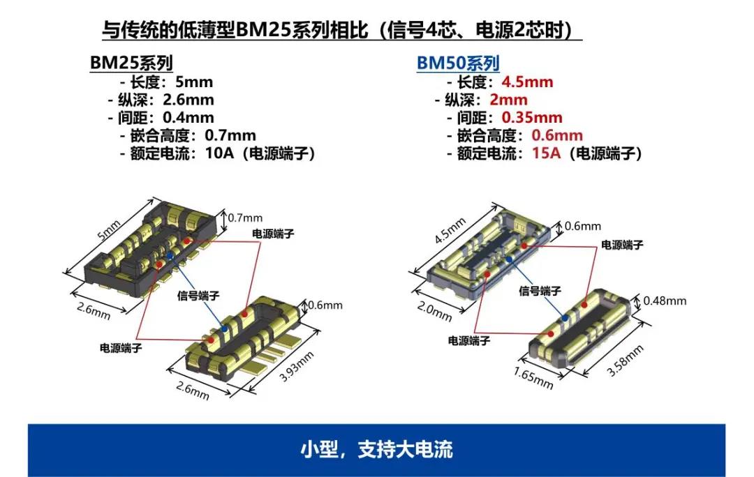 特點(diǎn) 1 兼顧供電能力和小型化的設(shè)計(jì) - 額定電流:支持電源端子15A、信號(hào)端子0.3A - 嵌合高度:0.6mm、縱深:2.0mm 2 通過(guò)全包覆構(gòu)造,確保高牢固性 3 使接觸電阻最小化,節(jié)省電力 4 實(shí)現(xiàn)小型,高抜出力 5 互相夾緊型多觸點(diǎn)構(gòu)造,確保高接觸可靠性 有助于小型化&大電流化