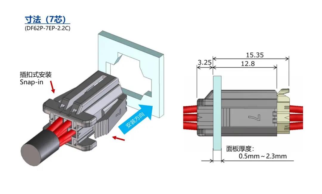 特點(diǎn) [SignalBee?] 2 x 2.2 mm間距 用于狹小空間纖細(xì)型中繼連接器(UL C-UL認(rèn)證產(chǎn)品) 1. 纖細(xì)光滑的外形適合狹窄空間的布線 2. 清晰的鎖扣感和目視可確認(rèn)是否鎖定 3. 可靠的接觸結(jié)構(gòu) 4. 堅(jiān)固的端子結(jié)構(gòu) 5. 芯數(shù)選型:2、3、4、5、6、7、13、24 DF62B:標(biāo)準(zhǔn)型 DF62C:鎖加部保護(hù)強(qiáng)化型 DF62P:面板安裝型 6. 可與DF11/DF59系列共用自動(dòng)壓著設(shè)備 7. 防冷凝措施(防水型DF62W) 細(xì)小